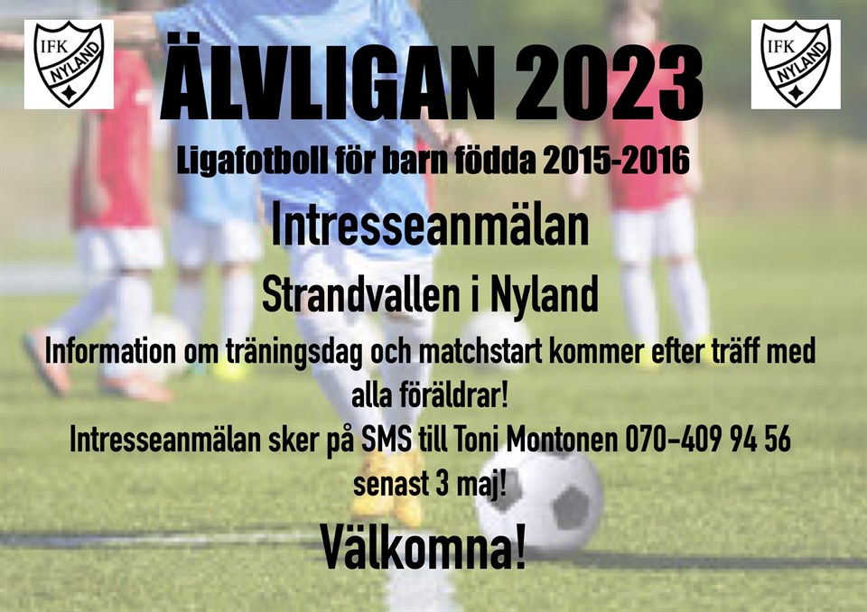 Intresseanmälan till IFK Nylands lag i Älvligan barn födda 2015-2016 i spelformen 5 mot 5! Se på affischen vart ni anmäler så blir ni kallade till ett föräldramöte efter anmälningstidens slut! Det kommer behövas föräldrar som engagerar sig som ledare för laget! Varmt Välkomna med er intresseanmälan😁 IFK Nyland 19 apr 2023 0kommentarer