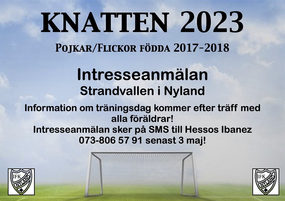 Intresseanmälan till IFK Nylands lag i Knatten barn födda 2017-2018 i spelformen 3 mot 3! Se på affischen vart ni anmäler så blir ni kallade till ett föräldramöte efter anmälningstidens slut! Det kommer behövas föräldrar som engagerar sig som ledare för laget! Varmt Välkomna med er intresseanmälan😁 IFK Nyland 19 apr 2023 0kommentarer