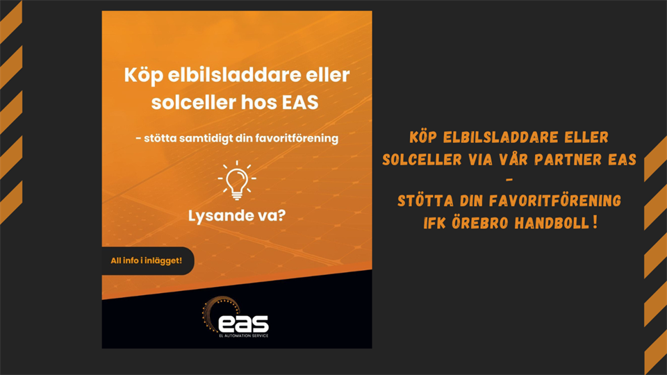 Köp elbilsladdare eller solceller via vår partner EAS - stötta samtidigt din favoritförening IFK Örebro Handboll! Funderar du på att installera solceller på din fastighet? Eller kanske en elbilsladdare? Vi hjälper dig med alla former av tjänster kopplade till elbilsladdare och solenergi. När du köper en elbilsladdare eller solceller skänker vi dessutom till 300 kr per laddare och 1500 kr för en solcellsanläggning till föreningen/laget - Lysande va? Har ni andra jobb som kräver elektriker så diskuterar vi ersättningen till laget. Kontakta Johnny så berättar han mer på johnny.strom@eas-el.se eller 070-349 02 17 Uppge IFK Örebro och vilket lag det avser. P-15/16 31 jan 0kommentarer