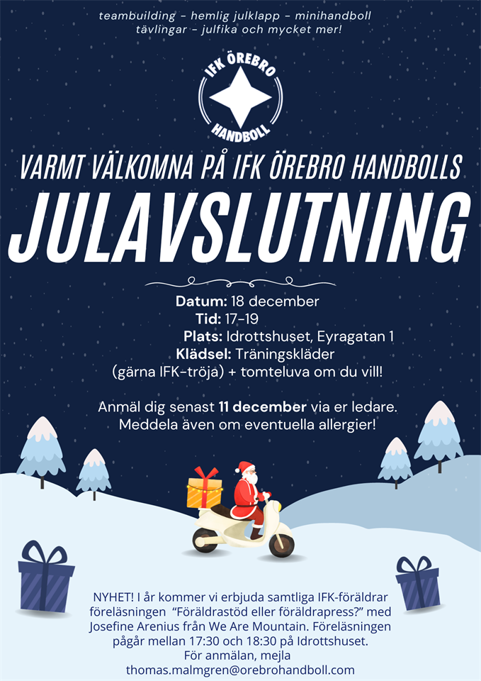 Den 3/12 kl 13:00 möter damlaget Skånela IF i damallsvenskan. P15 har under matchen hallansvar vilket betyder att vi bemannar kiosk samt är behjälpliga med städning efter match. Samling i Idrottshuset kl 12:00. Det som behövs är 3 personer som bakar för försäljning i kiosken samt tre vuxna som är där och hjälper till. Kommentera nedan ni som kan. Killarna kommer också att delta på lineup med damlaget, medtag egna shorts och skor, matchtröja finns på plats. Vi hoppas att så många som möjligt vill vara med, vi tittar sedan på matchen tillsammans. Extraträning för P15. Lördagen den 9/12 har vi fått möjlighet till en extra träningstid i Adolfsbergsskolan mellan kl 12-13:00. Separat kallelse kommer. /Ledarna P-15/16 17 nov 2023 19kommentarer