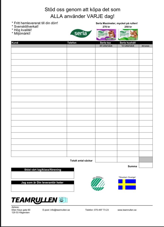 Hej, nu är våren här och det är dags att sälja toa & hushållspapper från Serla! Från klubben finns kravet att att man säljer något. 24 rullar Serla maximeter toalettpapper 270:-. 12 rullar Serka hushållspapper 250:-. Bifogar en bild man kan skriva ut för att kunna ta upp beställningar. Funkar inte det maila, så får du den så istället. Senast den 29 mars behöver du lägga din beställning till Isaks mamma Anna, anna.fm@live eller svara på den aktivitet som kommer att skapas på laget.se. Ni som har syskon i andra IFK lag kan välja ett av lagen dit ni lägger bestälningen, men då behöver ni meddela det så ni kan bli avprickade.