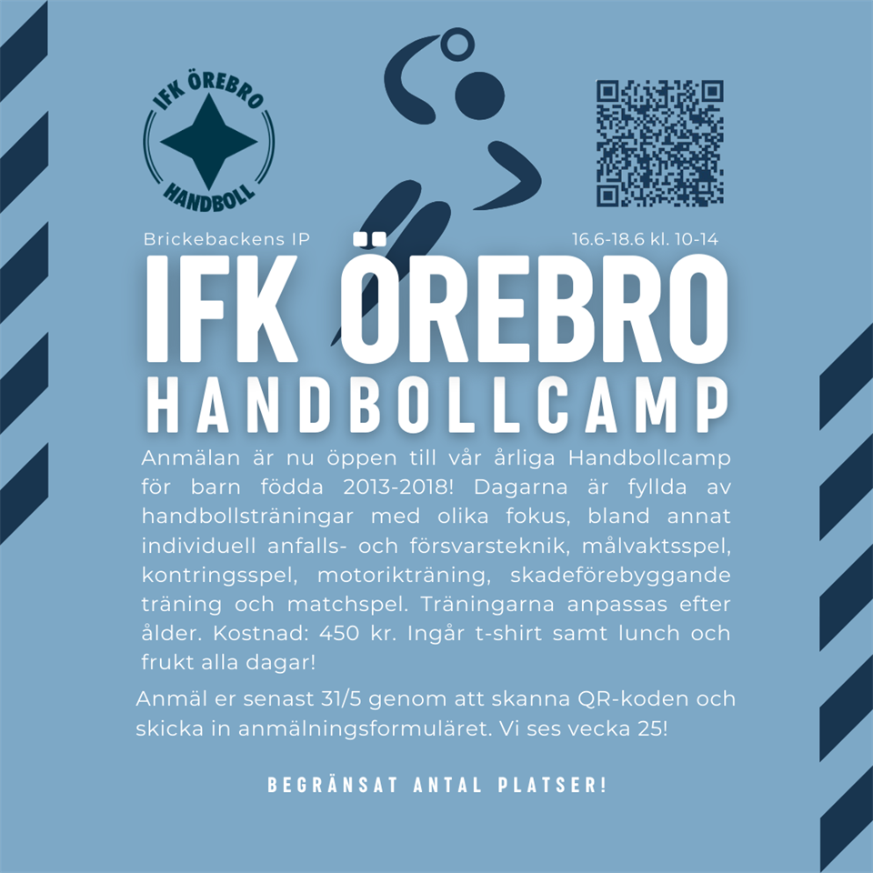 Anmälan är nu öppen till vår årliga Handbollcamp för barn födda 2013-2018! Dagarna är fyllda av handbollsträningar med olika fokus, bland annat individuell anfalls- och försvarsteknik, målvaktsspel, kontringsspel, motorikträning, skadeförebyggande träning och matchspel. Träningarna anpassas efter ålder. Datum: 16-18.6 (vecka 25) Tid: 10-14 Plats: Brickebackens IP Kostnad: 450 kr. Ingår t-shirt samt lunch och frukt alla dagar! Vi återkommer med betalningsinfo. Anmäl er senast 31/5 genom att fylla i anmälningsformuläret. Skanna QR-koden i bilden eller tryck här. Vi ses i juni! :-) /Thomas & Lotta P-15/16 10 mar 0kommentarer