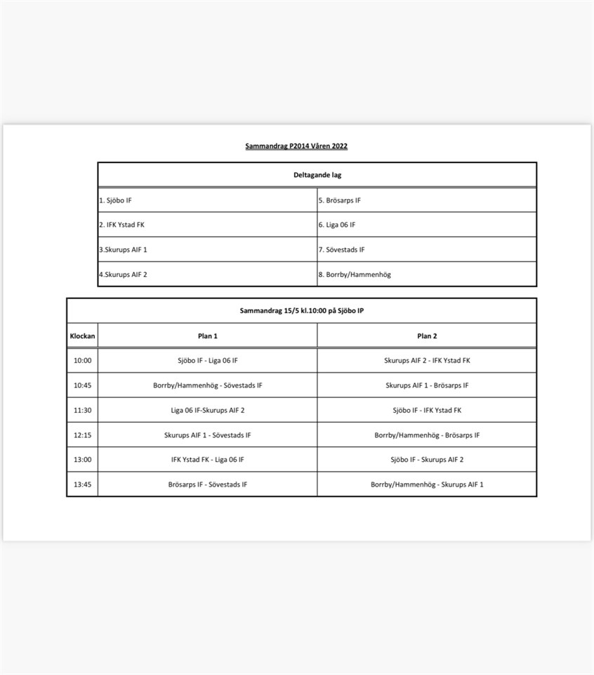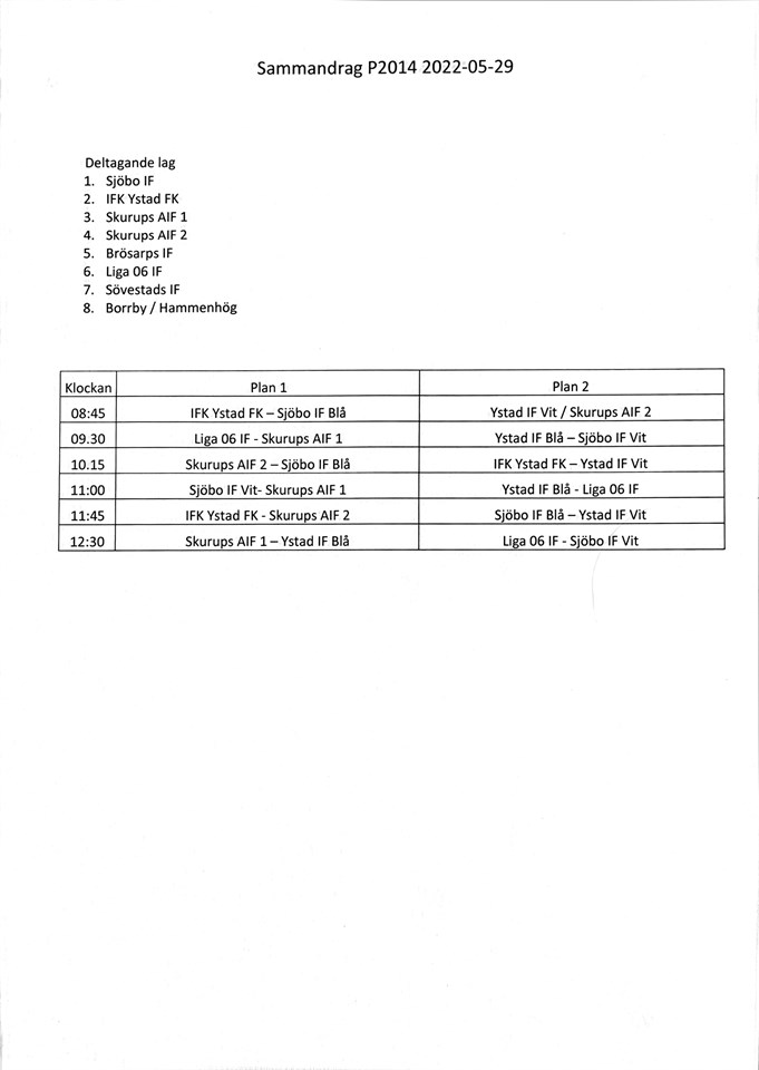 Hej Här kommer spelschema inför morgondagens P8 sammandrag i Sjöbo! OBS! Detta gäller spelare födda 2014 samt 2015! EJ AKTIV 14 maj 2022 1kommentar