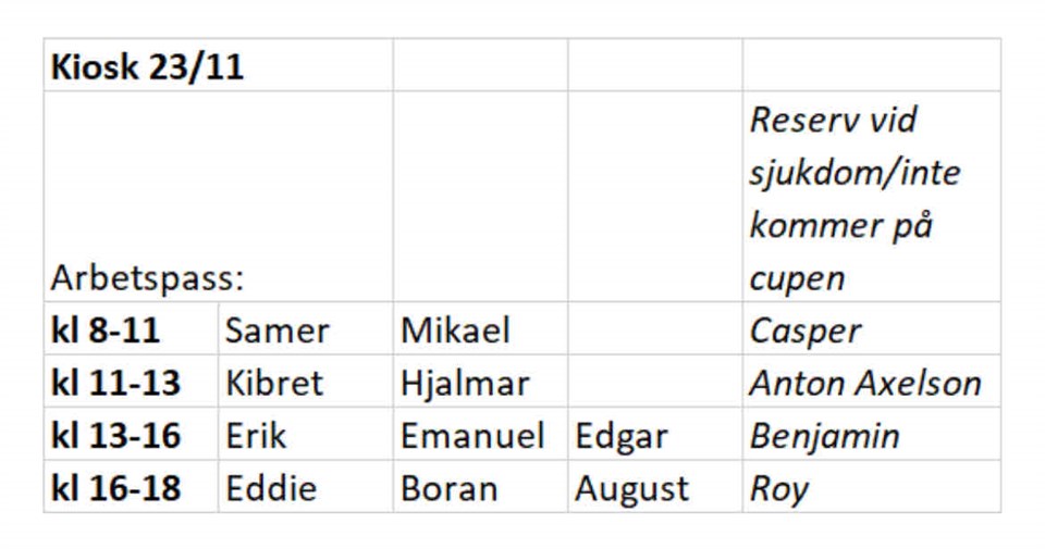Hej! Vi ska vara med och bemanna kiosken 23/11 ihop med IFK p16 Bifogat är schemat för det ☺ Kan man inte den tiden man blivit tilldelad är man själv ansvarig att byta med annan förälder. Vi ses den 23e ⚽