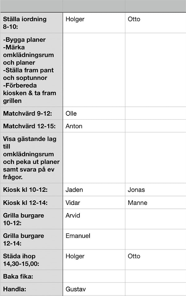 Ni får byta sinsemellan om någon uppgift inte passar.