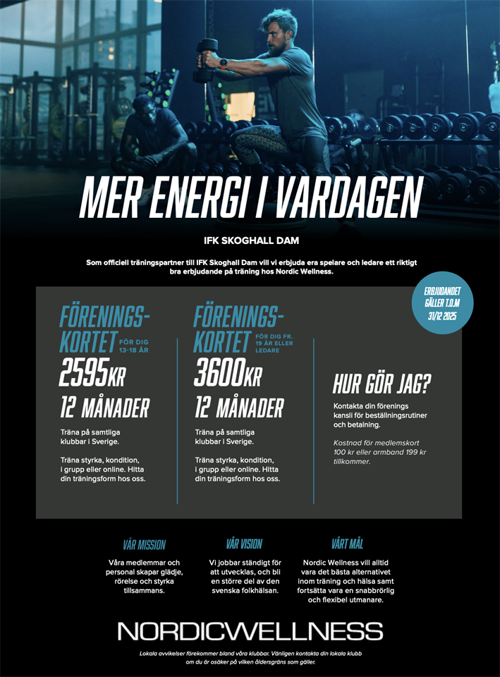 Genom vårt partnerskap med Nordic Wellness kan vi erbjuda spelare och ledare 13 år och uppåt grymma priser på träningskort. Spana in bilden och läs er mail för att ta del av erbjudandet.