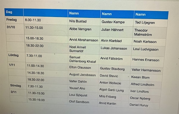 RapporteraVi kan byta så vi tar fredagen, alltså erat pass (Olof sandberg) så tar ni vårat pass på söndagen ( Arvid Abrahamsson )?