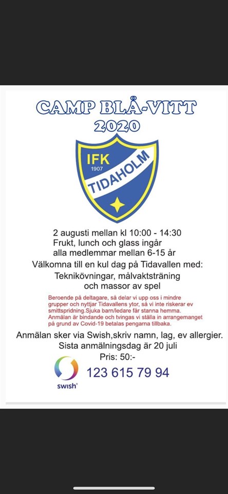 Hej på er! Hoppas alla har ett bra sommarlov och fin semester! Lite information inför hösten. Vi kör igång igen torsdag den 13 Augusti och vi börjar som vanligt klockan 17.00 till 18.00. Vi vill påminna er att anmäla er till camp blåvitt om ni är intresserade. Se information nedan 😊 Ha en fortsatt skön sommar så ses vi snart! / Ledarna F 12-13 (2013,2012) 19 jul 2020 0kommentarer