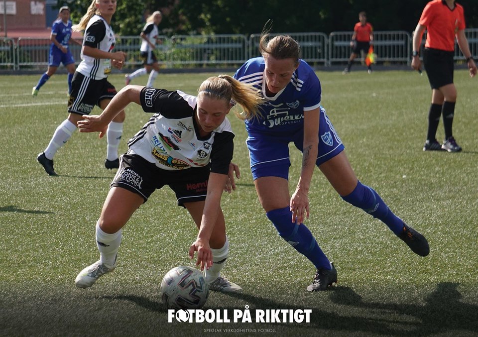 Vi startar matchen bra och har mycket boll utan att lyckas skapa dom riktigt heta chanserna. Första gången BK ordentligt kommer upp på vår planhalva slutar det olyckligt. Ett skott går på Maddes hand, jag kan inte se nån rörelse på armen utan den är utefter sidan och skottet kommer från två meter. Madde kan inte göra något och jag tycker ju att detta inte ska vara straff. Dessutom blir Madde varnad. 1-0 till BK på straff. Vi tappar fokus efter straffen och BK får ett större bollinnehav och hotar lite mer. I min 32 gör BK 2-0 när vi gör ett olyckligt ingripande framför vårt mål. Vi jobbar oss tillbaka och i min 40 kommer Hanna Helg fram på kanten och spelar in bollen som går direkt i mål. Målet föregicks av flera bra passningar på få tillslag, riktigt snyggt! Och nytt hopp. 2-1 till BK när vi går till pausvila. Andra halvlek startar bra och vi skapar några riktigt bra lägen första 30 min. Vi borde nog gjort ett eller två mål på de lägena, men det sista distinkta ingripandet saknades i dessa situationer. Tjejerna jobbar på bra mot ett som vi visste aggressivt och hårt jobbande BK. Några av våra spelare ställdes ju också mot spelare som tränar på allsvensk nivå och även gjort inhopp i allsvenskan. I min 81 får BK en hörna som nickas i mål. Lite för enkelt tycker vi på sidan men lätt att säga där vi står. Målet avgör matchen men fram till det tredje målet kunde matchen tagit en annan vändning. Vi laddar om för match mot Rimbo hemma på Iver arena på lördag kl 15. Bild från "Fotboll på riktigt"