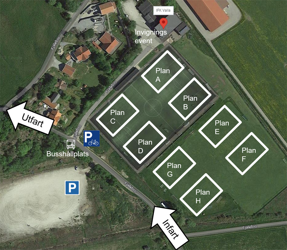 Nu på lördag 7:e oktober så är det dags för Vallaavslutning och invigning av vårt nya klubbhus! Hittills så har 750+ (!) personer anmält sig. Om väderprognosen håller i sig så förväntas vi alltså bli väldigt många på vårt kära Fjällebro denna dag. Här följer information om dagen med ungefärliga hålltider: 08:30 Samling för samtliga ledare och äldre lag (ej ledare för P17 och Knatte) 09:30 Samling för spelande barn i turneringen (Pojkar födda 2012-2016 & Flickor födda 2012-2017) 10:00 - 11:00 Turnering - 3st matcher per lag (varje match är 12 minuter) 11:00 - 11:15 Fika till alla aktiva (festis, banan och kexchoklad). P17 och Knatte ansluter till fikat. 11:15 - 12:00 Finalmatch + prisutdelning 12:00 - 14:00 Invigning av klubbhuset Kaffe och tårta serveras som en del av invigningen. Korv, toast, grillade hamburgare, drycker mm. kommer att finnas till försäljning. Begränsade parkeringsmöjligheter & buss från Häggvallsskolan Intresset är som sagt MYCKET STORT och våra parkeringsmöjligheter är begränsade då vi endast har 200 parkeringsplatser. Det är därför ett krav att vara minst 3 personer (helst fler) i varje bil för att kunna få parkera på Fjällebro. Bilar med färre besökare kommer att hänvisas till att parkera vid Häggvallsskolan för att istället åka med den inhyrda Nordiabussen. Cykel, promenad, skjuts är andra alternativ för att minska trycket på vår parkering samt bussen. Nordiabussens första avgång från Häggvallsskolan är 08:45. Bussen tar 55 personer. Bussen kommer kontinuerligt att köra slingan Häggvallsskolan - Fjällebrovallen - Häggvallsskolan mellan kl. 08:45 - 14:00. Påstigning vid grinden på Fjällebro och utanför entrén till Häggvallskolan. Häggvallskolans grusparkering är tillgänglig för att parkera på om man vill ta bussen. Ett varv med bussen beräknas ta ca 20 minuter beroende på trafikläget. Det kommer under dagen vara enkelriktad trafik på grusvägen, enligt bild. Parkeringsvakter kommer att finnas på följande platser för att hjälpa till: - Häggvallsskolan - Vid infart/utfart mot Hjältebyvägen - På grusplanen - Längs grusvägen för att förhindra parkering längs vägen (detta med tanke på om utryckningsfordon behöver komma fram). Nu ser vi fram emot en trevlig dag i fotbollens tecken! Välkomna! EN FÖR ALLA - IFK VALLA