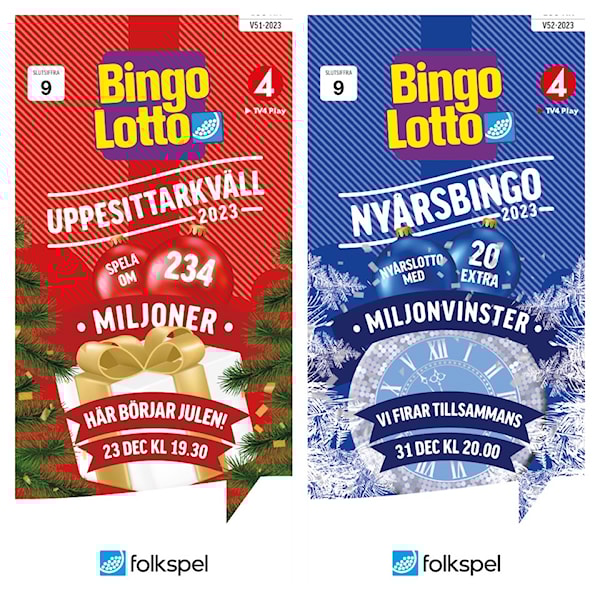 Även den 31 december håller BingoLottos Nyårskväll dig sällskap hela vägen över tolvslaget! En magisk festkväll fylld av musik, underhållning, och så klart – massor av bingo! Fira in det nya året tillsammans med BingoLotto! Programmet börjar klockan 20:00 i TV4.