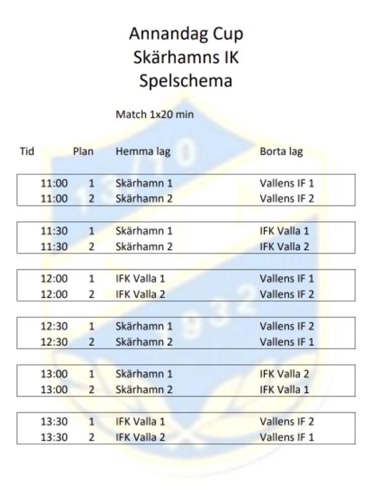 Imorgon är det dags! Vi kommer att spela med två lag och båda lagen kommer att spela fyra träningsmatcher var mot Skärhamn och Vallen, se bild för hålltider. Kiosken är öppen och det kommer att säljas hamburgare. Matchställen fås på plats Samling: 10:45 Plats: Röavallen