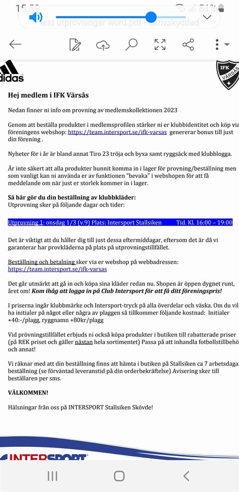 Ska ni köpa träningskläder och behöver utprovning? Utprovning av träningskläder 1/3 16:00-19:00 på Intersport Stallstiken. Testar att skicka med en länk för att beställa kläder: https://team.intersport.se/ifk-varsas P -12-13 26 feb 2023 0kommentarer