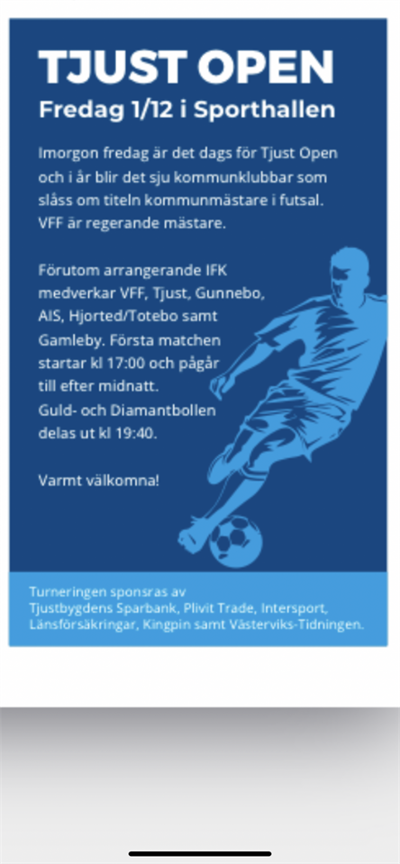TJUST OPEN IMORGON FREDAG KL 17.00 🔵 Imorgon kväll avgörs årets Tjust Open i Sporthallen dvs inofficiella kommunmästerskapet i futsal. Första matchen spelas kl 17.00 och finalen är klar lagom till midnatt, IFK medverkar med både herrlaget och juniorlaget och övriga deltagande lag är: VFF, Tjust, Ankarsrum, Hjorted/Totebo, Gunnebo, Gamleby. Varmt välkomna! IFK Västervik 30 nov 2023 0kommentarer
