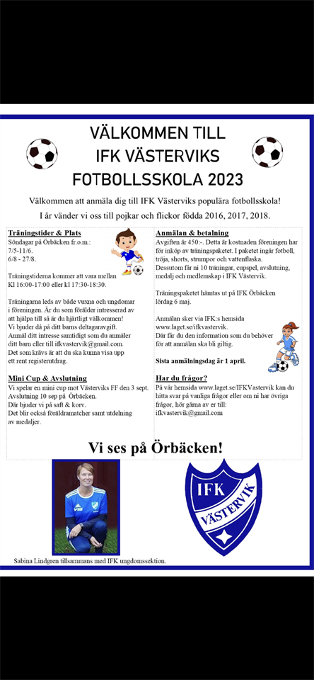 Nu på söndag 6/8 återstartar fotbollsskolan och för att fira ”skolstarten” lite extra bjuder IFK på glass. Under augusti och början av september väntar träningar, fotografering, minicup mot VFF för de två äldsta grupperna och så avslutning 10/9 med medaljutdelning. Varmt välkomna tillbaka 🔵🔵 IFK Västervik 31 jul 2023 0kommentarer