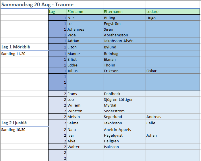 Hej alla, kul att vara igång igen. Här kommer lite kort info. Sammandrag nu på söndag den 20 augusti i Traume. Vi kommer med 2 lag och matcherna börjar 11.00 Lagindelning kommer senare. Vi välkomnar Oskar Eriksson till ledarstaben. Hans son Julius har också börjat spela med oss. Vi välkomnar även Albert till laget som gjorde sin första träning i tisdags. Hoppas ni kommer trivas. Vi ses på söndag i Traume, ni som har den mörkblå matchtröjan hemma får gärna ta med. Glöm inte heller fotbollsskor, benskydd och vattenflaska! /Tränarna PS. Svara gärna så fort ni kan på kallelser, det underlättar enormt mycket i vår planering. DS.