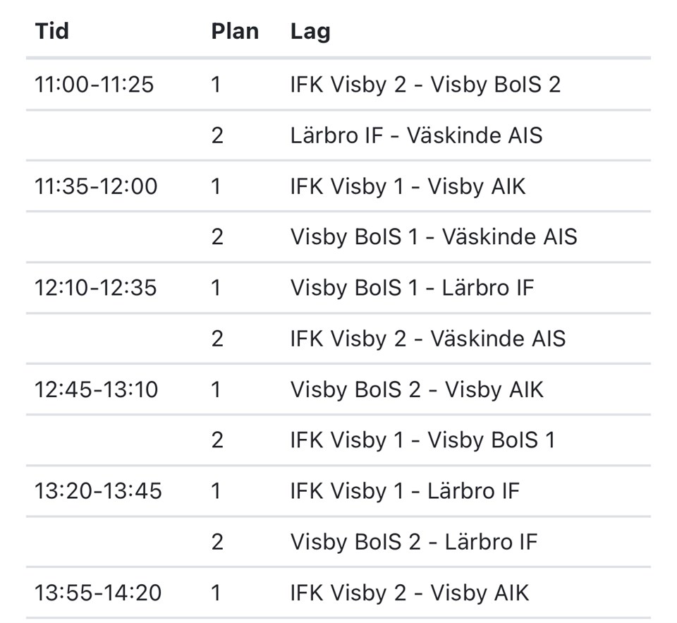 Hej. Jag fick ett nytt schema från Visby AIK precis nu. Ligger bifogat. Det positiva är att sammandraget är lite nedkortat. Tyvärr behöver IFK lag 1 vara på plats lite tidigare då första match för dem är 11.35. IFK lag 1 samling 11.05 /Hugo