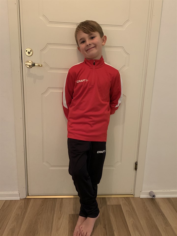 Här ser ni bild på Måns i den nya overallen. Byxorna är ganska långa så vi har valt en storlek mindre i byxorna.