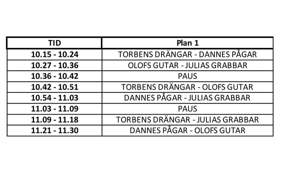 På söndag är det dags för julavslutning och då blir det miniturnering på stor plan! Samling ombytta senast 10.00 för lite uppvärmning. Klockan 10.15 är det avspark för första matchen. Alla lag spelar tre matcher (1 x 9 minuter). Det är vanliga träningskläder som gäller, glöm inte skor, benskydd och vattenflaska. Sista matchen är färdig klockan 11.30, då blir det fika! Här är lagindelning: JULIAS GRABBAR Måns, Lucas B, August, Oliver P, Noah HR, Noah GH och Hjalmar. OLOFS GUTAR Arvid, Aron, Axel, Ossian, Melker A, Isak och Hugo. DANNES PÅGAR Linuz, Lexus, Albert, Milian, Collin, Kean och Oliver H. TORBENS DRÄNGAR Melker H, Nathaniel, Ture, Albin, Vidar, Viggo och Leon. Enväldiga domare är i vanlig ordning Daniel (Hjalmars pappa) och Mattias (Isaks pappa). Vi ses på söndag! // Ledarna