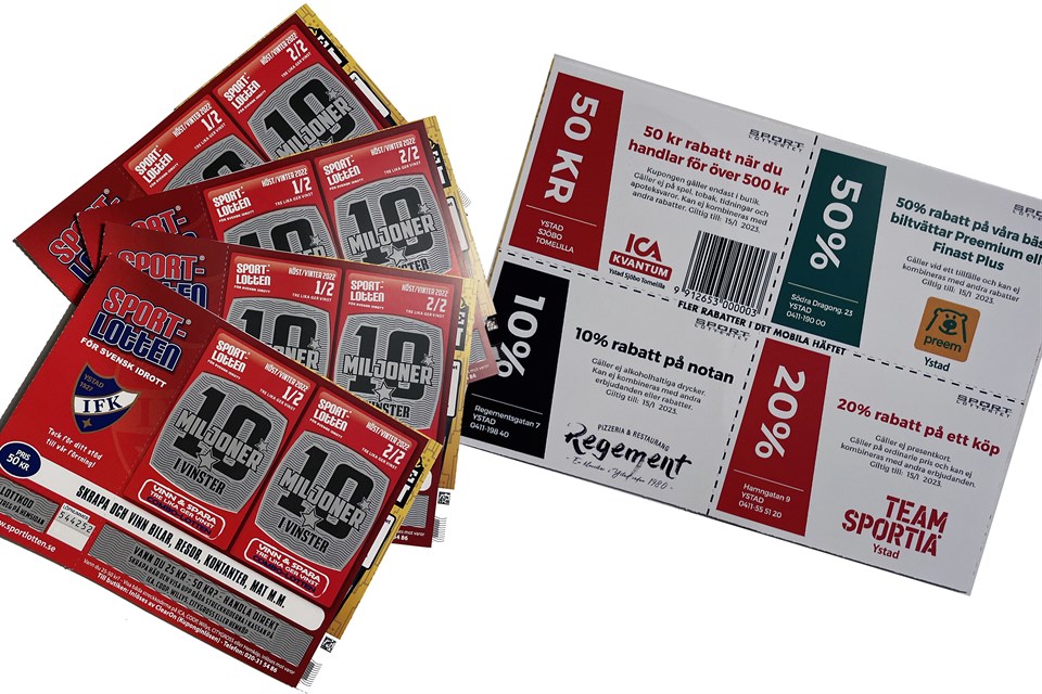 IFK Ystad FK har tecknat avtal med Sportlotten och vi kommer under fyra säljperioder under en tvåårsperiod att sälja deras lotter. Varje lag kommer att få ett antal lotter som ska säljas under säljperioden. De kommer att delas ut inom kort. Lotterna kostar 50 kronor styck och innehåller två skraplotter. Där har man chansen att vinna en ny bil till ett värde av 350 000 kronor. Förutom bilvinsten finns det även rese- och kontantvinster. Vinster på 25 och 50 kronor kan lösas in mot varor på Ica, Coop, Willys, Citygross och Hemköp. Förutom vinstchansen på lotterna medföljer också olika rabattkuponger. Det handlar dels om lokala rabatter på Ica Kvantum, Preem, Pizzeria Regementet och Team Sportia. Men lotten innehåller också en kod som öppnar också upp ett digitalt rabatthäfte som gäller i hela landet. För klubben innebär det här en bra inkomstkälla. 25 kronor av lottpriset går tillbaka till IFK Ystad FK i vinst. Av vinsten tillfaller 20 procent det enskilda laget. P9 30 aug 2022 0kommentarer