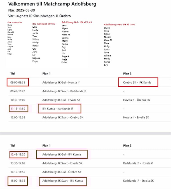 På bilden ser ni matchtiderna och vilka matcher ert barn spelar samt står över.