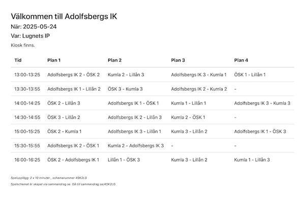 För er som spelar i lag 3 - första matchen är kl 13.30 så det räcker att ni samlas 13.00. Ni får givetvis komma tidigare om ni vill!