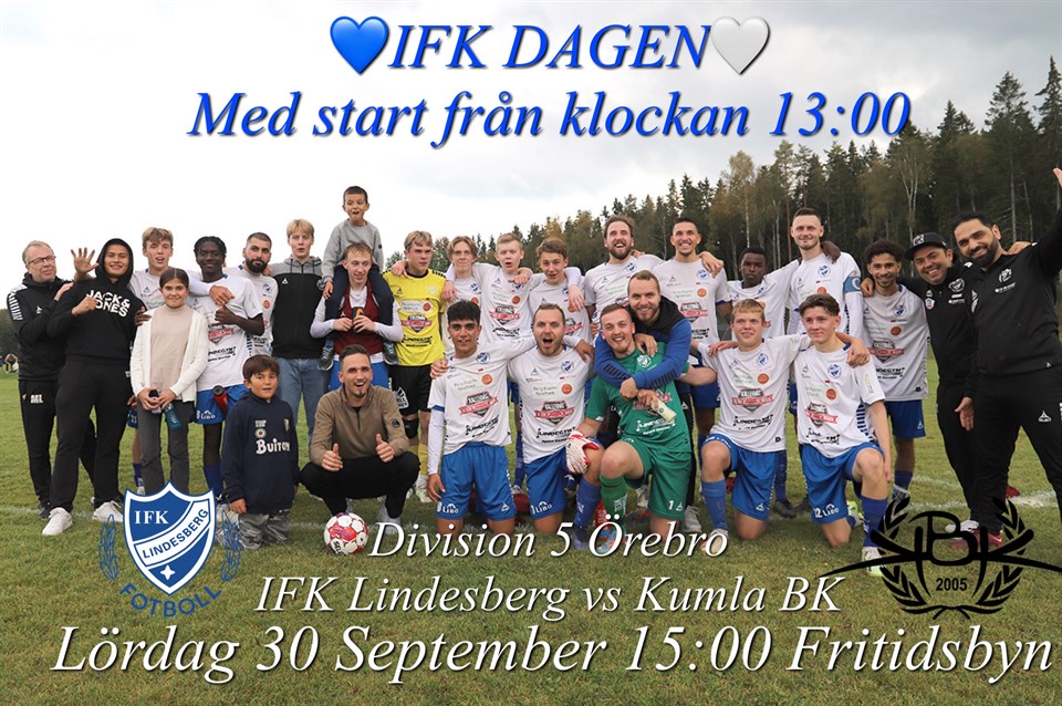 På lördag är det dags för sista hemmamatchen för säsongen i serien. Vi tar emot Kumla BK kl 15:00 på Fritidsbyn Det är även den årliga upplagan av IFK Dagen, läs mer om IFK Dagen på laget.se/Ifklindesberg Under ingången till matchen kommer @ifklindesbergbollskola att agera maskotar och även bjuda på underhållning under pausen där dom kommer att spela lite fotboll! Vädrets ser ut att bli kanon så ta er upp till Fritidsbyn och heja fram grabbarna till seger och njut av dagen uppe på Fritidsbyn
