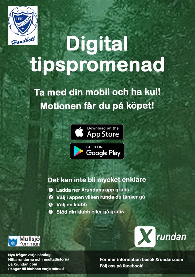 Välkomna att gå Xrundans digitala tipspromenad som IFK Mullsjö står som värd för. Det är gratis att gå men om man väljer att betala så kan man sponsra sin favoritklubb (IFK Mullsjö handboll) så får vi nästan hälften av pengarna direkt till klubben. Vår klubb har ju låga medlemsavgifter men betalar ändå allt vad gäller cuper, bollar osv för våra medlemmar. Hjälp gärna till att sprida informationen till släkt och vänner så att många upptäcker och går denna tipspromenad, Toppen vore ju att alla även betalar och väljer oss som favoritklubb. På söndag mellan kl 14-16.00 står vi och instruerar vid starten utanför Landh's. Man kan dock börja var man vill och när man vill. I appen ser man karta var frågorna sitter. Nya frågor kommer upp söndag morgon varje vecka. För mer info: https://xrundan.com/ Välkomna!