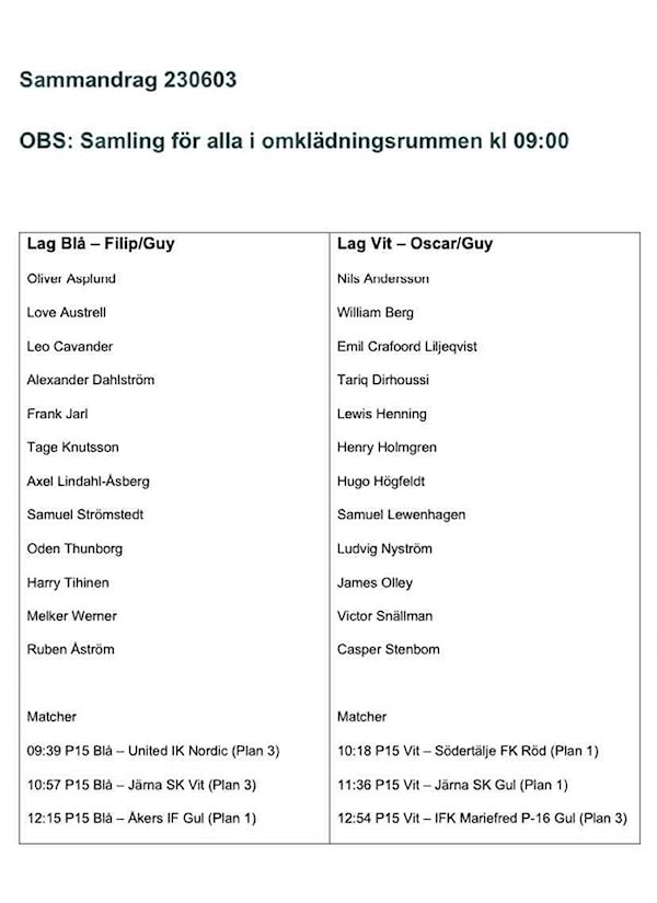 Hej, se bifogad bild för samlingstid i Järna samt lagindelning och spelschema!