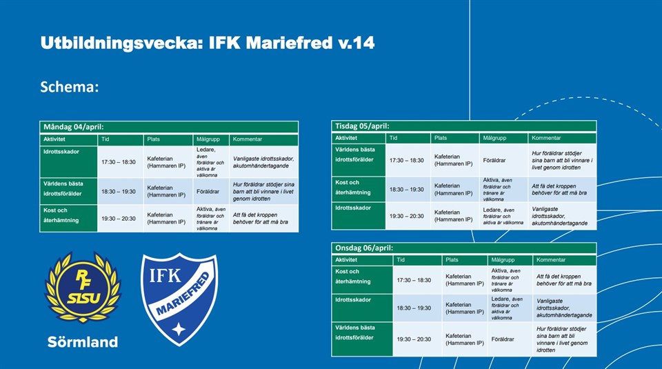 IFK Mariefred tillsammans med RF-SISU Sörmland välkomnar er till utbildningsveckan (4-6 april) där korta föreläsningar (45–60 minuter) erbjuds till ledare/tränare, föräldrar och de aktiva med syfte att bli bättre rustade för att bemöta olika utmaningar. Föreläsningar som erbjuds: - Idrottsskador - Världens bästa idrottsförälder - Kost och återhämtning Passa på att ta del av och bredda era kunskaper! MÅNDAG 4 APRIL Idrottsskador 17:30 – 18:30 Kafeterian (Hammaren IP) Målgrupp: Ledare, även föräldrar och aktiva är välkomna Kommentar: Vanligaste idrottsskador, akutomhändertagande Världens bästa idrottsförälder 18:30 – 19:30 Kafeterian (Hammaren IP) Målgrupp: Föräldrar Kommentar: Hur föräldrar stödjer sina barn att bli vinnare i livet genom idrotten Kost och återhämtning 19:30 – 20:30 Kafeterian (Hammaren IP) Målgrupp: Aktiva, även föräldrar och tränare är välkomna Kommentar: Att få det kroppen behöver för att må bra TISDAG 5 APRIL Världens bästa idrottsförälder 17:30 – 18:30 Kafeterian (Hammaren IP) Målgrupp: Föräldrar Kommentar: Hur föräldrar stödjer sina barn att bli vinnare i livet genom idrotten Kost och återhämtning 18:30 – 19:30 Kafeterian (Hammaren IP) Målgrupp: Aktiva, även föräldrar och tränare är välkomna Kommentar: Att få det kroppen behöver för att må bra Idrottsskador 19:30 – 20:30 Kafeterian (Hammaren IP) Målgrupp: Ledare, även föräldrar och aktiva är välkomna Kommentar: Vanligaste idrottsskador, akutomhändertagande ONSDAG 6 APRIL Kost och återhämtning 17:30 – 18:30 Kafeterian (Hammaren IP) Målgrupp: Aktiva, även föräldrar och tränare är välkomna Kommentar: Att få det kroppen behöver för att må bra Idrottsskador 18:30 – 19:30 Kafeterian (Hammaren IP) Målgrupp: Ledare, även föräldrar och aktiva är välkomna Kommentar: Vanligaste idrottsskador, akutomhändertagande Världens bästa idrottsförälder 19:30 – 20:30 Kafeterian (Hammaren IP) Målgrupp: Föräldrar Kommentar: Hur föräldrar stödjer sina barn att bli vinnare i livet genom idrotten Varmt välkomna ledare/tränare, föräldrar och aktiva! Hälsningar IFK Mariefred