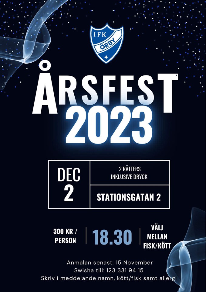 Glöm inte att anmäla er till årsfesten. Sista anmälningsdag är den 15/11. Anmälan görs i samband med betalningen! IFK Örby 13 nov 2023 0kommentarer