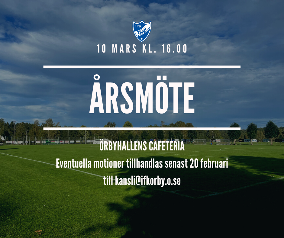 IFK Örby välkomnar alla medlemmar till årsmöte den 10 mars klockan 16.00 i Örbyhallens cafeteria. Mer info kommer upp under fliken dokument. Eventuella motioner skall vara styrelsen tillhandla senast den 20 februari via mail till kansli@ifkorby.o.se Välkomna! IFK Örby 31 jan 2024 0kommentarer