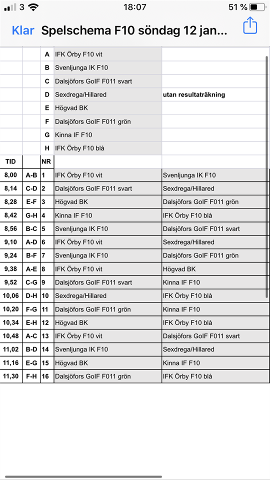 Nu är det snart dags för Blåkläder cup. Vi spelar tidigt på söndag. Vi har två lag anmälda. Första laget börjar redan klockan 8 och andra laget har första matchen 8:42. För att vi ska orka, så kommer alla att få spela någon match med det andra laget också. Lagen meddelas på träningen på fredag och vi samlas i Svenljunga 45 minuter innan första matchen, det vill säga 7:15 eller 8:00, beroende på vilket lag man är med i. Jag har bifogat spelschemat för dagen.