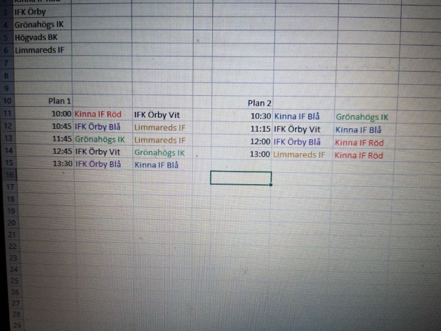 Ett lag har dragit sig ur i morgon. För att få ihop spelschemat ändå, fick vi frågan om att ha två lag. Jag sade att vi fixar det, så det kommer att bli mycket speltid i morgon . (För att vi ska orka är alla välkomna att delta) Första matchen är fortfarande 10:00, men sista är numer 13:30. Jag bifogar spelschema. Ursäkta att detta kommer så sent, men fick inte det nya spelschemat själva, förrän alldeles nyss.