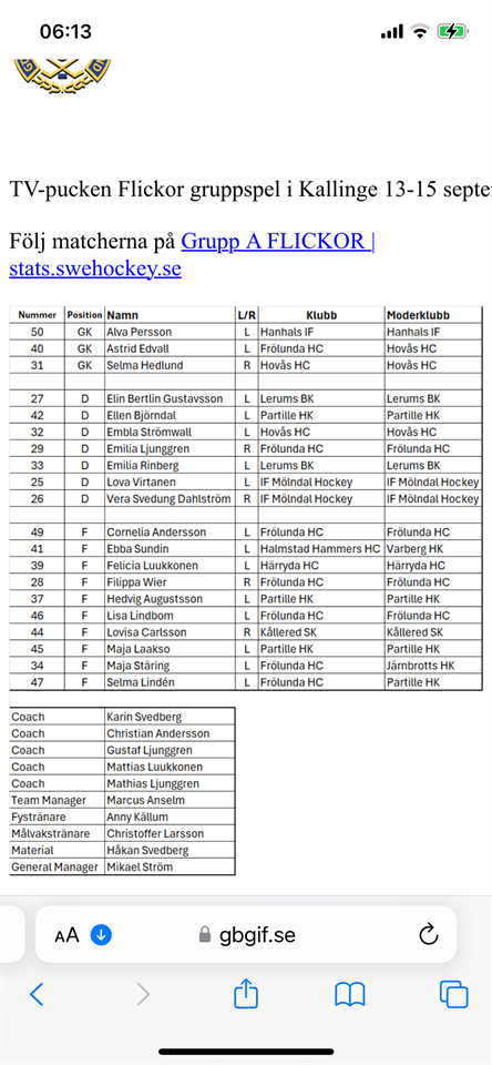 Här är den färdiga truppen i sin helhet till Tv pucken tjej 2024! Extra glada är vi givetvis att vi har TVÅ duktiga Mölndalsspelare med ! Rolig notering är också att småföreningarna slår mamma Frölunda lite på fingrarna med antal spelare uttagna ! Bara att kämpa vidare ! Tjejhockey 20 aug 2024 1kommentar