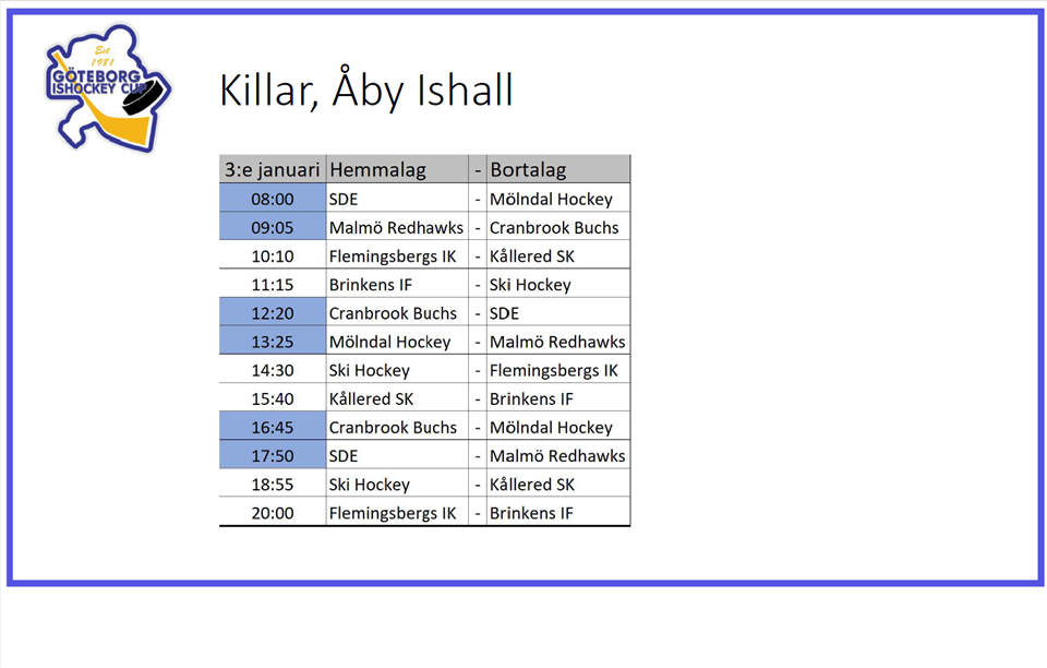 Hej! Vi har nu fått våra pass att bemanna för JVM 19/12 och 22/12 och GIC 3-6/1. Uppdaterat schema (samma som gick ut i WhatsApp-gruppen) finns nu, där jag även lagt in bemanning för våra hemmamatcher i fortsättningsserien. Det nya är markerat i rött. Det blir för smått och dålig upplösning att lägga schemat som nyhet här, så det ligger även som en pdf bland dokumenten på lagets sida (klicka på "Mer" uppe till höger i listen - välj "Dokument" och mappen "Säsong 23/24"). Under GIC spelar vi i Åby 3-4/1. Vi har därför fått alla våra pass under dessa två dagar. Vårt lag bemannar helt sekretariatet den 3:e och 4:e (TSM, klocka, speaker, inte båsdörrar). Tanken är att de som har pass ändå skall ha möjlighet att följa matcherna. Förutom bemanning under JVM 19:e och 22:e har vårt lag fått ett ytterligare pass: försäljning 50/50-lotter i Scandinavium på nyårsafton 13.30 till start period 3 (match Sverige-Finland; matchstart 14.30). Två minuter (!) efter att jag lade ut info i WhatsApp-gruppen om detta räckte Per upp handen och kammade därmed hem detta pass! Försök i första hand att byta med någon om det inte funkar, men som vanligt ser vi ju till att lösa det tillsammans på något sätt. Vi ses! /Henrik