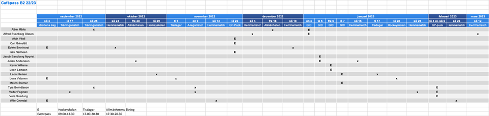 Hej! (Har även skickat som mail där man kan se schema i bra upplösning). Vi har just fått fördelningen de olika lagens bemanning av café och event utöver café under hemmamatcher. Till stor del liknar det tidigare år med tisdagsöppet café, hockeyskola på lördagar och comeback för öppet café under allmänhetens åkning på fredagar. En nyhet är att styrelsen gett varje lag i uppdrag att bemanna en A-lagsmatch var. Det handlar om att stå i insläppet från en timme innan matchstart fram till 5 minuter in i andra perioden (totalt 2,5 timmar) och ta betalt. Även om allmänhetens åkning är tillbaka och A-lagsmatcherna skall bemannas har vårt lag inte fått fler pass än tidigare, vilket bl.a. beror på att D-grupp är stor och tar många pass. De events som vi känner till i dagsläget är GP-puck och GIC (cup just efter årsskiftet). Vi har inte fått någon detaljerad fördelning av hur dessa bemannas, så jag har utgått från hur det har sett ut tidigare år. Vissa justeringar kan alltså ske. Förmodligen tillkommer även någon A-lagsmatch och kanske något mer, men det löser vi när vi vet. Under event brukar det handla om bemanning av café, sekretariat, städning och andra uppgifter. Principen för schemat är som förra säsongen att alla hjälps åt med events (idrottens dag, GP-puck, GIC) och de familjer som inte är ledare delar på passen för hemmamatcher, tisdagar, allmänhetens åkning och hockeyskolan. Passen har fördelats så jämnt som möjligt. Om man har svårigheter med något pass är det fritt fram att hitta någon att byta med. Det görs kanske enklast i WhatsApp-gruppen. Det brukar fixa sig genom att vi hjälps åt och pusslar lite. Cafépoolen finns annars att tillgå (gå in på klubbens sida, bredvid loggan och klubbnamnet finns dropdown där man kan välja ”Café”. I listen under loggan ser man då rubrik ”Cafépool” med info, namn och telefonnummer). Ju tidigare man kontaktar cafépoolens medlemmar desto större är givetvis möjligheten att någon kan ställa upp. Nya medlemmar till cafépoolen brukar vara välkommet. Jag tror att man skall vara minst 16 år, men man behöver inte ha någon familjemedlem i klubben, så såväl t.ex. äldre syskon som deras kompisar är välkomna till poolen. Hör av er till mig om ni har någon kandidat. Vi är jätteglada över att ha våra nya spelare i laget! Hör av er till mig om ni vill ha en genomgång av caféet och hur det funkar där. Om flera är intresserade kan vi ha en gemensam genomgång (även de som varit med i laget längre är självklart välkomna), annars är det bara att säga till så visar jag gärna i anslutning till någon träning. Det brukar inte vara några problem och kunderna är snälla, men om det känns osäkert kan jag säkert ofta ansluta och vara med i början om ni vill när ni skall ha ert första cafépass. Hör av er om det är något ni funderar över. Vi hjälps ju som sagt åt och brukar kunna fixa och få ihop det så att det funkar för alla. Vi ses! /Henrik