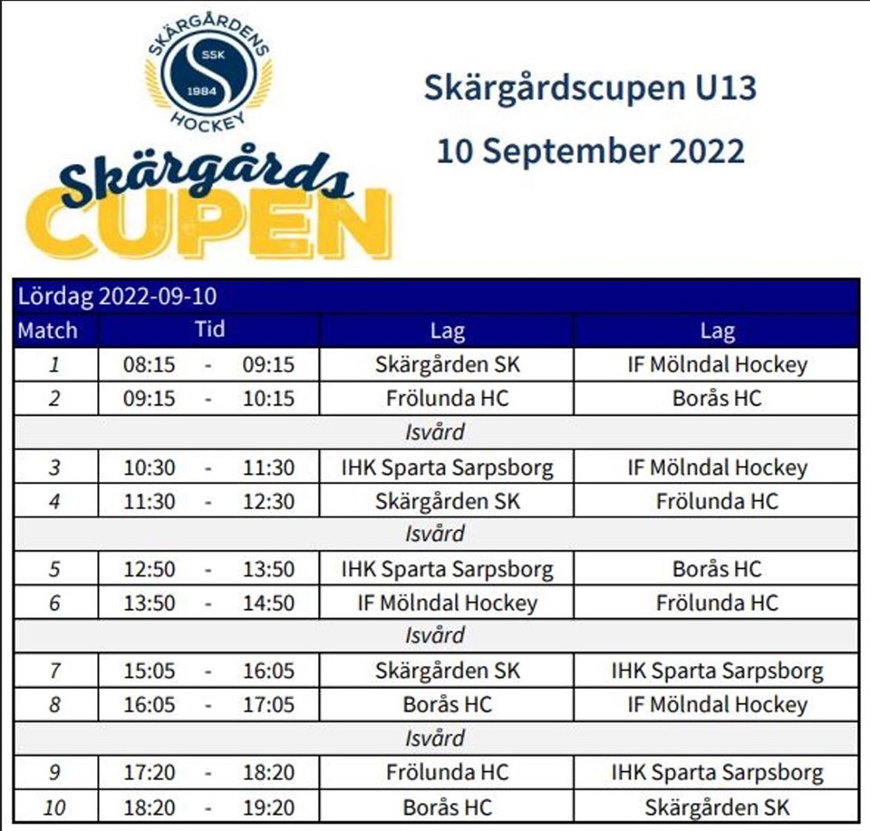 Hej, Nu är spelschemat satt för Skärgårdscupen. Den aktivitet som lagts för att blocka kalendern skickas även ut som kallelse, hoppas så klart att alla kan vara med! För komplett spelschema se här. Cupen är en endagscup och spelas 10 sept. Vi siktar att samlas kl 07:15 (kolla färjetiderna så att ni hittar lämplig båtfärd). Första matchen spelas kl 08:15 och sista matchen är slut runt kl 17. Vi får både lunch och enklare middag (hamburgare) på plats. Café finns också på plats. Kommer bli grymt kul! //Ledarna Team 10