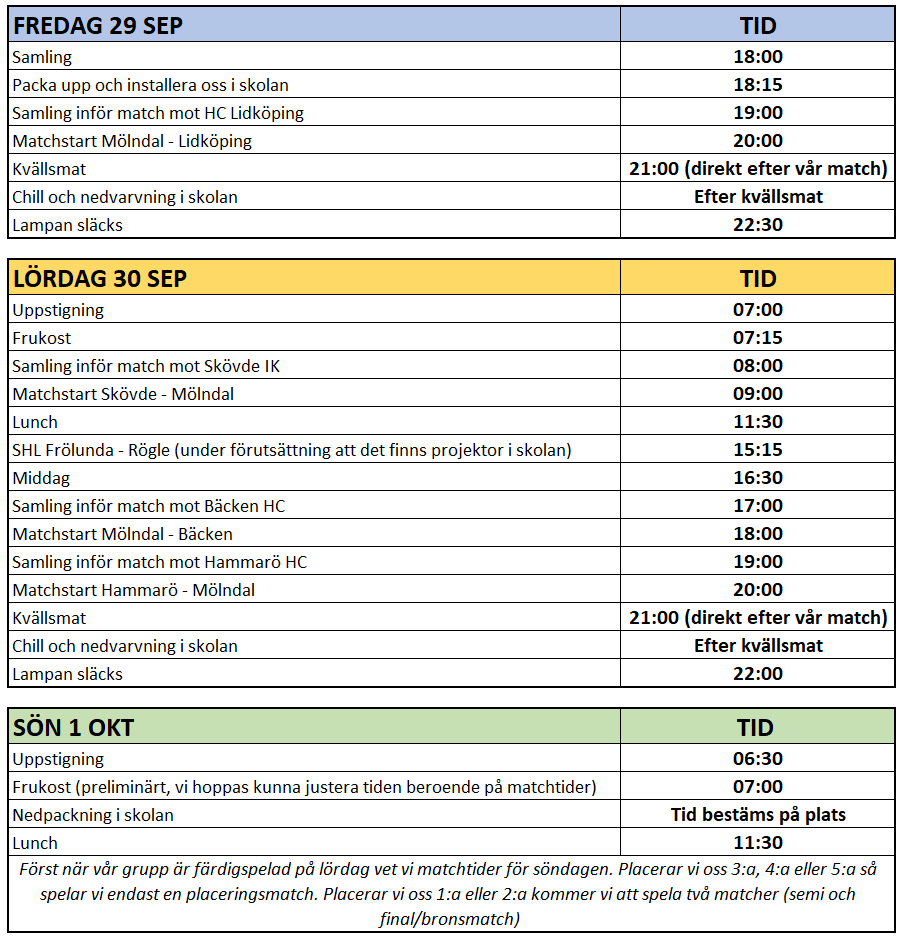 Nu är det snart dags för cup! Var: Grästorp När: Fre 29 sep - sön 1 okt Tid: Samling på parkeringen vid Grästorps ishall kl 18 (sista match på söndagen startar kl 17 om vi går till final) Vi har gjort ett detaljerat schema utifrån den infon vi har just nu men justeringar kan bli aktuella. All information om cupen finns på cupsidan här. FREDAG 29 SEP Samling 18:00 Packa upp och installera oss i skolan 18:15 Samling inför match mot HC Lidköping 19:00 Matchstart Mölndal - Lidköping 20:00 Kvällsmat 21:00 (direkt efter vår match) Chill och nedvarvning i skolan Efter kvällsmat Lampan släcks 22:30 LÖRDAG 30 SEP Uppstigning 07:00 Frukost 07:15 Samling inför match mot Skövde IK 08:00 Matchstart Skövde - Mölndal 09:00 Lunch 11:30 SHL Frölunda - Rögle (under förutsättning att det finns projektor i skolan) 15:15 Middag 16:30 Samling inför match mot Bäcken HC 17:00 Matchstart Mölndal - Bäcken 18:00 Samling inför match mot Hammarö HC 19:00 Matchstart Hammarö - Mölndal 20:00 Kvällsmat 21:00 (direkt efter vår match) Chill och nedvarvning i skolan Efter kvällsmat Lampan släcks 22:00 SÖN 1 OKT Uppstigning 06:30 Frukost (preliminärt, vi hoppas kunna justera tiden beroende på matchtider) 07:00 Nedpackning i skolan Tid bestäms på plats Lunch 11:30 Först när vår grupp är färdigspelad på lördag vet vi matchtider för söndagen. Placerar vi oss 3:a, 4:a eller 5:a så spelar vi endast en placeringsmatch. Placerar vi oss 1:a eller 2:a kommer vi att spela två matcher (semi och final/bronsmatch). 08:00 Placeringsmatch 5a Grupp 1 5a Grupp 2 09:30 Semifinal 1 1a Grupp 1 2a Grupp 2 11:00 Semifinal 2 1a Grupp 2 2a Grupp 1 12:30 Placeringsmatch 4a Grupp 1 4a Grupp 2 14:00 Placeringsmatch 3a Grupp 1 3a Grupp 2 15:30 Bronsmatch Förlorare semi 1 Förlorare semi 2 17:00 Final Segr semi 1 segr semi 2 Praktisk info Efter att vi samlats fredag kväll går vi gemensamt till skolan som ligger 200 m bort och installerar oss, packar upp och bäddar sängar. Därefter går vi tillbaks till ishallen och startar uppladdningen. Vi kommer att ha ett eget omklädningsrum under hela cupen. Vi sover i en skolsal på hårt golv så vi behöver ha med luftmadrass/liggunderlag, kudde och täcke. I övrigt gäller att ha med det som behövs för hockeycup; några ombyten, handduk, fyskläder, mobil och laddare etc. Glöm inte tofflorna, det är skönt att glida runt i. Det finns ett bra café på plats och mataffär 500 m från ishallen, så det är bra om alla har med sig lite pengar för inköp. Det är nötförbud på cupen så undvik detta. Alla måltider i schemat ovan ingår i cupavgiften. Mobiltelefoner kommer vi att samla in men man kommer att få ha dom en stund på kvällen och så samlas de in på morgonen igen. Det finns en fotbollsplan i anslutning till ishallen så några får gärna ta med fotboll. Om man lovar att inte skada sig ;-) Efter lunchen på lör kl 11:30 så har vi inte match förrän kl 18 (samling kl 17). Men tiden däremellan kommer att gå fort och vi kommer försöka fokusera på att inte bränna för mycket energi då. Får vi till det så slänger vi upp SHL-omgången på storbild i skolan och vi kommer också lämna ut allas mobiler en stund. Har ni några funderingar eller saknar information så hör av er! Hälsningar Ledarna Team 10
