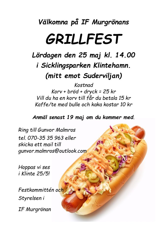 Välkomna på GRILLFEST Lördagen den 25 maj kl. 14.00 är du välkommen till Sicklingsparken i Klintehamn på grillning tillsammans med IF Murgrönan. Parken ligger mitt emot Suderviljan. Kostnad: Korv + bröd + dryck = 25 kr. Vill du ha en korv till får du betala 15 kr. Kaffe/te med bulle och kaka kostar 10 kr. Anmäl senast 19 maj om du kommer med. Ring till Gunvor Malmros tel. 070 35 35 963 eller skicka ett mail till gunvor.malmros@outlook.com Festkommittén och styrelsen