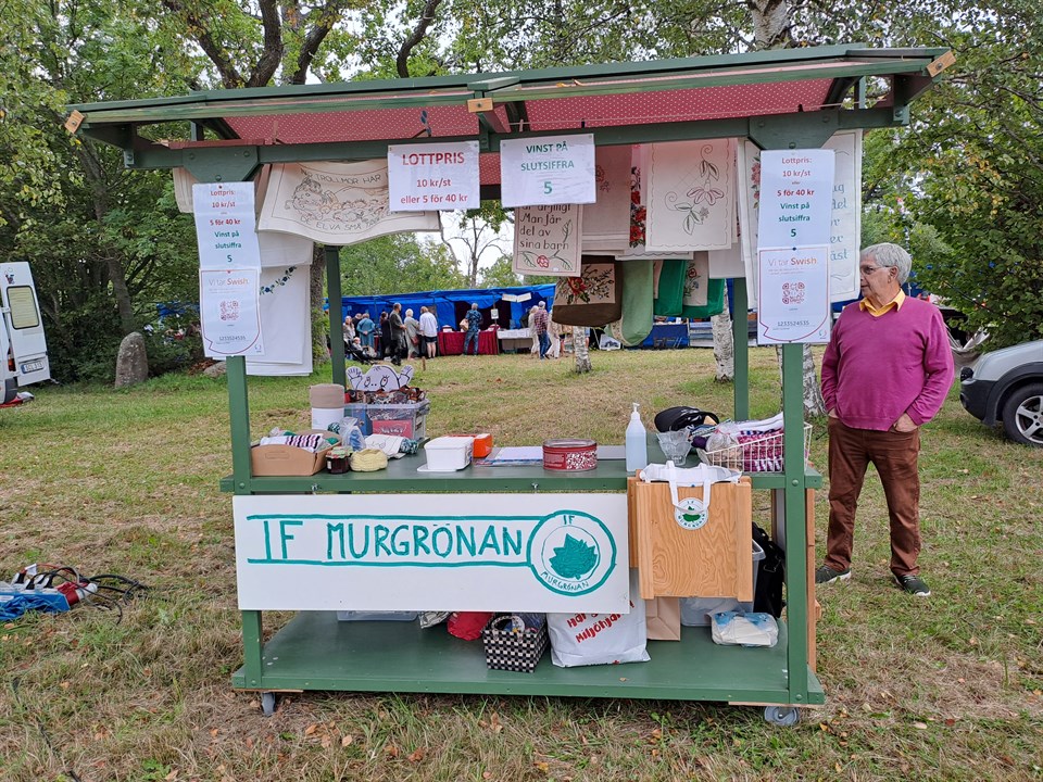 Kvart i sju på lördagsmorgonen startade vi I Sanda för att ta oss med vårt marknadsstånd till Kräklingbo marknad. Klockan hann inte nio innan de första kunderna kom och sen var det nästan jämn ström med kunder, med lite stiltje emellanåt. Strax efter klockan två var alla tusen lotterna sålda och alla 100 vinsterna utdelade till höger och vänster. Det gick alltså väldigt bra för Sykällingarna idag. Tack Einar, Barbro, Inger, Märta, Ivan och naturligtvis Rune som lastat och kört och lastat och kört igen. Tack alla som broderat, virkat, stickat, sytt, kokat m.m. Nu är ståndet hemma och inkört i ladan igen och väntar på nästa utflykt till Hemse om två veckor. Gunvor