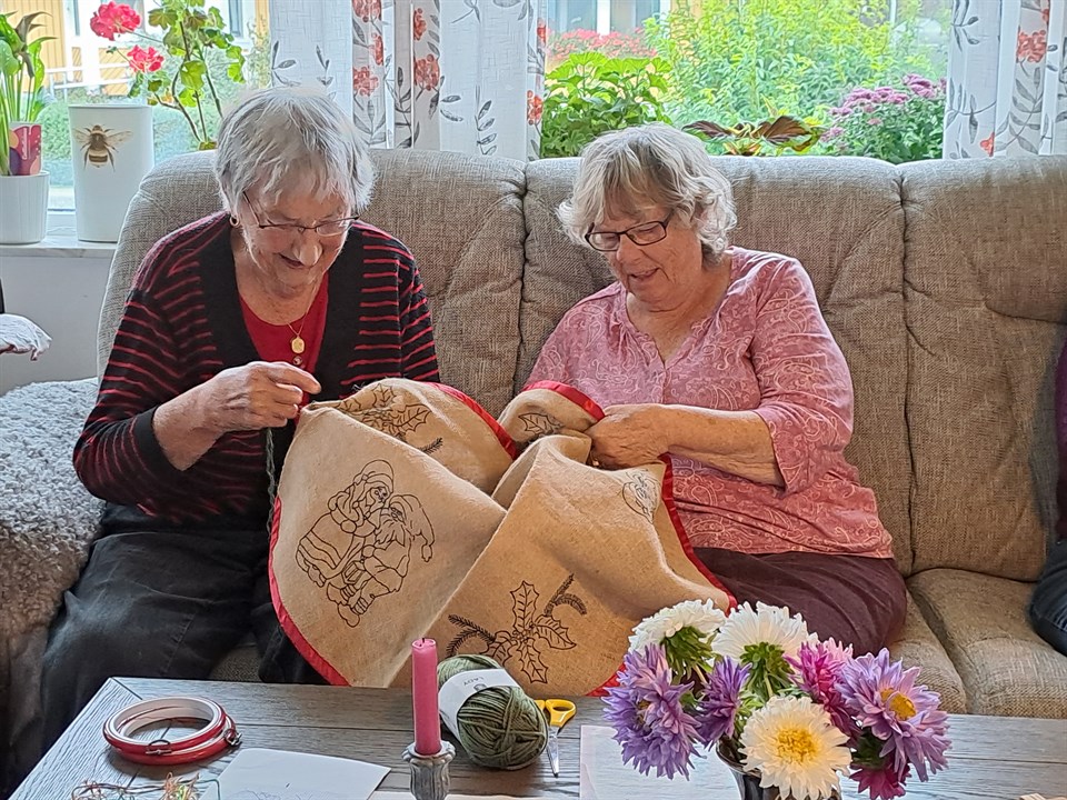 Inom IF Murgrönan finns en liten grupp som kanske inte syns så mycket på tävlingarna. Vi kallar oss "Sykällingar" och det är vi som tillverkar alla vinster till lotterierna som säljs på marknader. Vi är åtta damer som träffas regelbundet och att vi trivs ihop märks på att vi nästan alltid är med allihop, det är bara sjukdom som håller oss borta. Den senaste medlemmen är Asta som har varit med sedan första träffen i höst. Nu har vi haft det ganska hetsigt, med tre marknader i september, Kräklingbo, Hemse och Klintehamn. Det innebär att vi har sålt ca 3000 lotter och för att kunna sälja så många lotter måste vi skaffa fram 300 vinster. Lotterna har varit lättsålda, många marknadsbesökare har som tradition att köpa lotter av IF Murgrönan, det hör till. Igår, 3 oktober, träffades vi hos Stina i Hogrän och då kollade vi om vi har vinster till ett eventuellt jullotteri till julmarknad i Klintehamn. Det har vi! Förutom att sticka, virka och brodera har vi mycket att prata om och naturligtvis dricker vi kaffe, vi turas om att ha med oss kaffebröd, igår var det Barbros tur och hon bjöd på äppelpaj. Bildtext: Har man inget eget arbete med sig så får man dela med någon annan. Britten har delat med sig av sin julgransmatta till Asta. Fler bilder finns på hemsidan. Foto: Gunvor