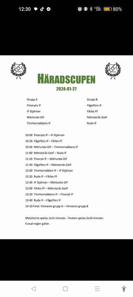 På lördag spelar vi vinterns sista inomhusturnering, nämligen Häradscupen i Fliseryds sporthall. Vi spelar i samma grupp som Fliseryd, Timmernabben och Mörlunda. Varmt välkomna till Fiiseryd och heja fram grabbarna! 💚 Herrar 24 jan 2024 0kommentarer