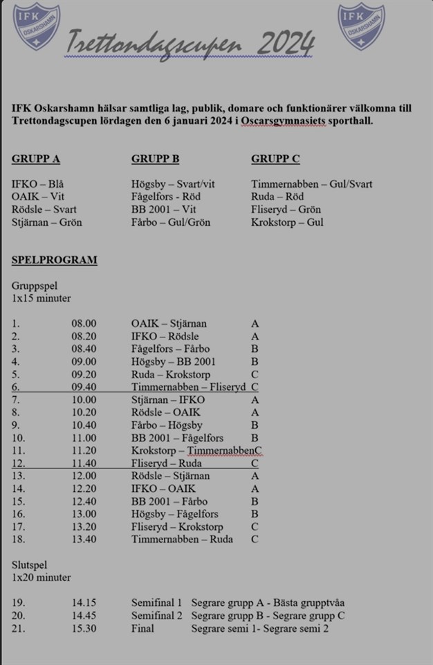 På lördag 6e januari spelas årets upplaga av IFKs populära trettondagscup i Oscarsgymnasiet. Vi spelar i samma grupp som IFKO, OAIK och Rödsle BK. Vi inleder cupen klockan 8:00 mot OAIK. Hela spelschemat ses i bilden. Vi ses i hallen 💚 Herrar 3 jan 2024 0kommentarer