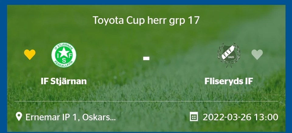 Imorgon lördag 26 mars klockan 13:00 är det dags att runda av gruppspelet i Toyota Cup. Matchen spelas på Ernemar IP och Fliseryds IF står som motståndare. Varm välkomna! Herrar 25 mar 2022 0kommentarer