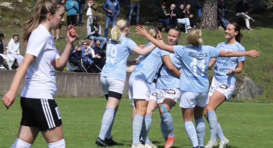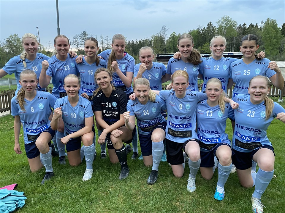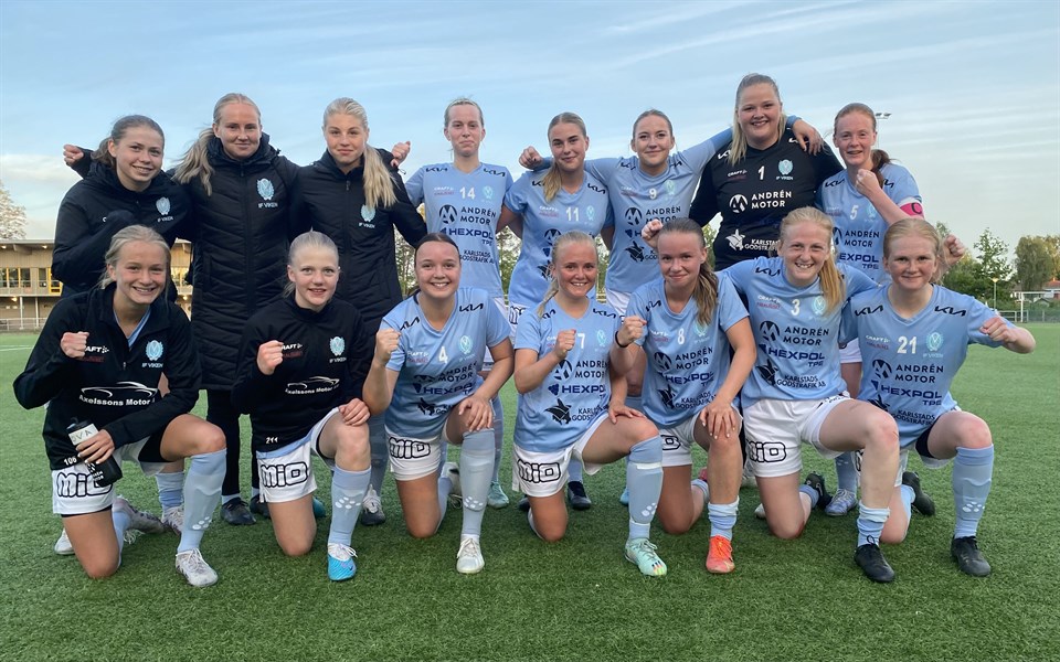Viken firar Wilma Enarssons 1-0 mål IF Viken – Vänersborg FK 5-1 (3-0) Hemmapremiär på Rösvallen slutade i vinst. Efter två tunga nederlag reser sig laget, visar prov på effektivitet och bjuder på hela fem mål mot Vänersborg. Redan efter några minuter sköt Wilma Enarsson in matchens första mål, tätt intill målvaktens vänstra stolpe. Efter 20 minuter blev Lisa Jansson fälld i straffområdet och Saga Eriksson satte säkert 2-0 på straff. Första halvlek avslutades med att Evelina Väyrynen nickade in 3-0 vid en hörna. Andra halvlek hinner precis starta när Vänersborg kvitterar och det skapas lite nerv i matchen. Bortalaget skapar några bra lägen att göra fler mål men då kliver Alice Olsson fram och gör några bra och stabila ingripanden i målet. En bit in i andra avgör vi matchen, Nellie Löwenhamn sätter bra press på sin ytterback och vinner tillbaka bollen, avancerar mot mål och prickskjuter in 4-1 vid målvaktens främre stolpe. På övertid gör vår mittback Evelina sitt andra mål för dagen och vi tar en välbehövlig trepoängare. Bra reaktion efter två förluster. Spelarna är väl medvetna om de utmaningar vi står inför och de fortsätter jobba hårt. I denna match fick vi välförtjänt utdelning på de chanser vi skapar och det är glädjande med flera olika målskyttar. Vår centrallinje gör en stabil insats och gott att Nellie är tillbaka och gör sina första 90 minuter för säsongen. Matchens spelare Lisa Jansson. Nästa match spelas måndagen den 29 maj och vi möter Skoftebyns IF på bortaplan.