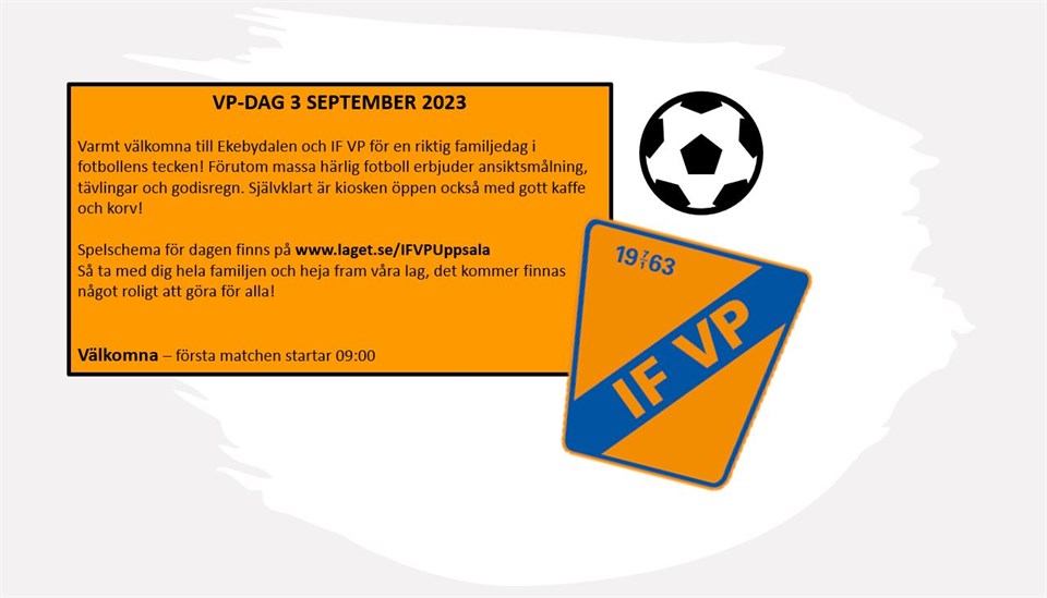 YAY! Dags för Ärets roligaste dag - VP dagen! Boka in den 3 september för en dag fylld med fotboll, tÀvlingar (vem vill inte lÀgga en straff pÄ vÄra seniormÄlvakter eller testa hur hÄrt man skjuter?), godisregn och ansiktsmÄlning! Första matchen startar 09:00 och sen hÄller vi pÄ fram till ca 18:00. Varmt vÀlkomna till Ekeby! IF VP Uppsala 16 aug 2023 2kommentarer
