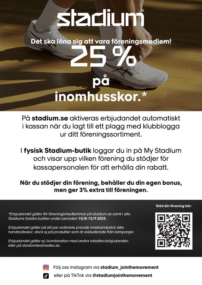 Inför nya säsongen kan det vara dags för nya inomhusskor, se bilden för rabatt på Stadium och hur ni går till väga för att stötta vår förening.