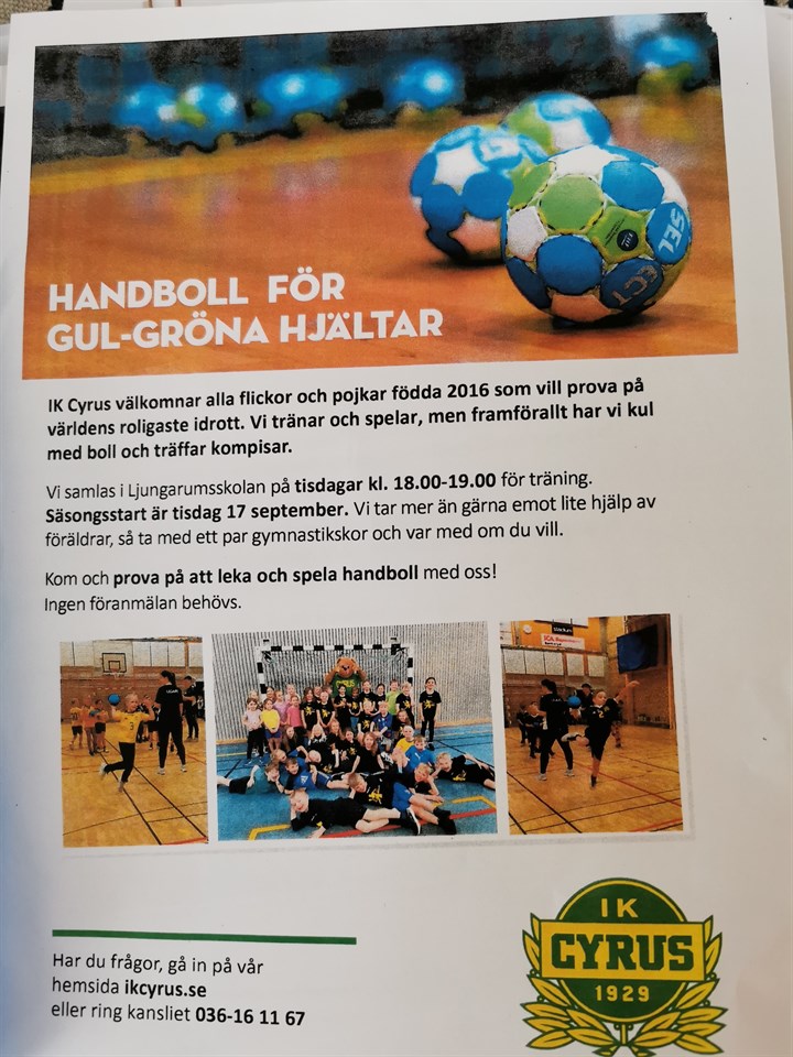 På tisdagar kl 18.00 träffas både killar och tjejer i åk 2för handbollsträning. Vi behöver fylla på med barn så vi blir två hela lag både ett flicklag och ett pojklag så nya spelare hälsas välkomna. Vi träffas 1 ggr/vecka och vi spelar 2 handbollsfestivaler per termin. Handbollsfestival innebär att man spelar minihandboll och möter lag från andra närliggande föreningar. Vi hade en ambition att vi skulle haft föräldramöte förra veckan, men vi skjuter fram det tills fler kommer igång nu i oktober och fotbollen haft avslutning. Är man osäker så får man gärna pröva några gånger innan man bestämmer sig. Välkomna! F9/8 (2016-17) 27 sep 2024 0kommentarer