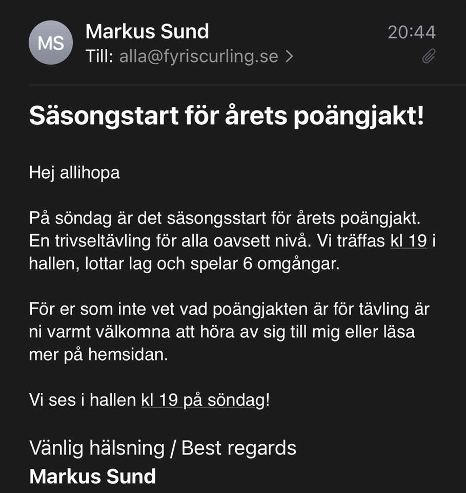 Ni har väl inte missat att Poängjakten startar? Perfekt tillfälle att få spela matcher med olika personer. Lagen lottas. Superkul! Curling-ungdom 10 okt 2024 0kommentarer
